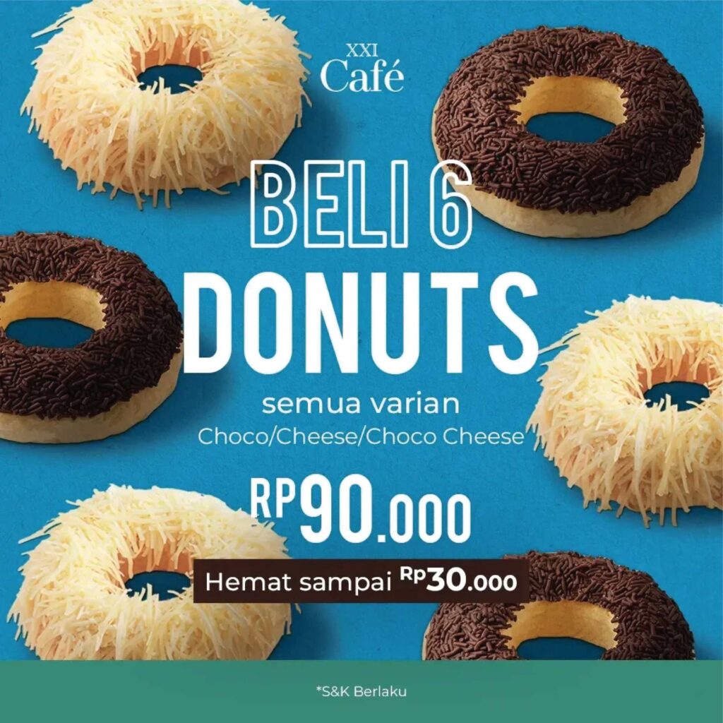 Donat favorit dengan harga spesial – Beli 6 donat, hemat sampai 30ribu! Bisa pilih varian rasa yang tersedia: Choco, Cheese, dan Choco Cheese 😍 Mantap buat makan ramean sama temen dan keluarga buat dicemil di bioskop atau #dibawapulang loh. Jajanan XXI Cafe_ID dijamin #FixASIK pokoknya 🙌 📍Lt.3 Mal Ciputra Cibubur