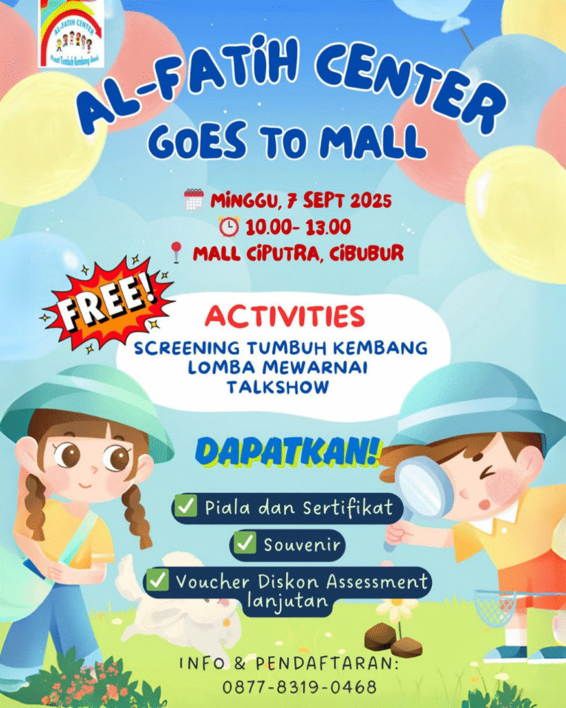 Serunya belajar & bermain di Al-Fatih Center Goes to Mall! ๐ Mall Ciputra Cibubur ๐ Minggu, 7 September 2025 | โฐ 10.00 โ 13.00 โจ Activities: ๐จ Screening Tumbuh Kembang ๐๏ธ Lomba Mewarnai ๐ค Talkshow ๐ก Jangan lewatkan kesempatan untuk dapatkan: ๐ Piala & Sertifikat ๐ Souvenir ๐ Voucher Diskon Assessment Lanjutan ๐ฒ Info & …