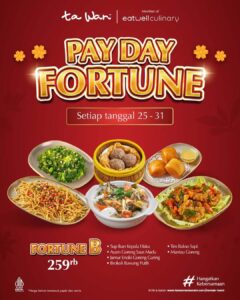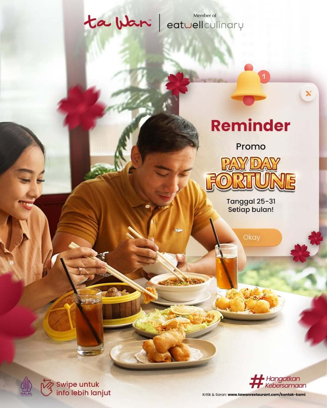 Rayakan momen gajian dengan manjakan diri sendiri dan mereka tersayang. Tak perlu repot, solusinya ada di Ta Wan! Dengan memanfaatkan Promo Pay Day Fortune, gajian makin hoki, makan makin hemat.